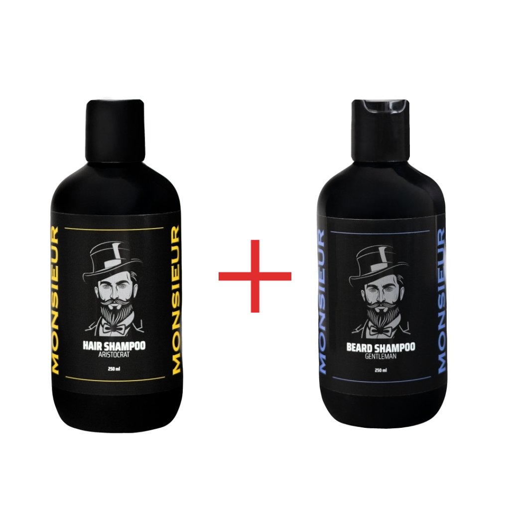 Monsieur Hair Shampoo důkladně myje vlasy, osvěžuje pokožku a zanechává přirozený objem bez zatížení. Beard Shampoo je vyvinut speciálně pro vousy – čistí je jemně, zabraňuje svědění a připraví je na další péči.
